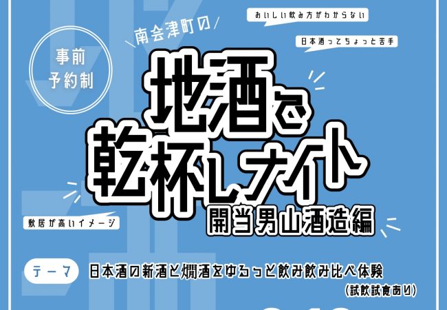 ————-セミナー概要————– ■第4弾テーマ 日本酒の新酒と燗酒をゆるっと飲み比べ体験 ■講師蔵元 開当男山酒造 ■開催 2026年2月13日(金)18:00~19:00 ■場所 会津田島駅2階ステーションプラザ2階 ■対象者・条件 南会津町に在住または勤務されている20代~30代の方。 *(必須)普段SNSを使用している方* ■参加費 2,000円(当日は試飲・試食有り) ■定員 先着20名様まで ■申込み https://docs.google.com/forms/d/16cPt4WDskekd8HPpgvyZk__4oVs0X_y3oJ4XKBB2uzo/edit ■その他 当日の様子をSNSで発信していただいた方は、 町内の一部店舗で使用出来る400円分のクーポンをセミナー終了後にお渡しいたします。 (1週間有効)使用店舗は申込み先のページから確認ください。