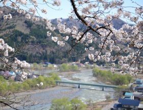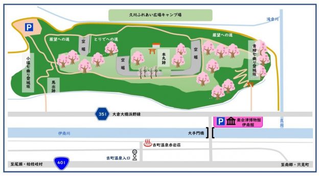 春になると久川城跡にソメイヨシノ、しだれ桜が咲きます。眼下に伊南川が流れ、散策やお花見におすすめです。