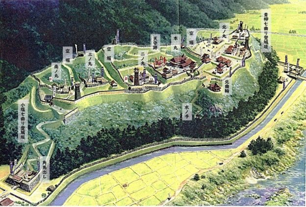 中世の約300年間、会津は蘆名氏によって治められていました。天正17年(1589)に会津を攻め滅ぼした伊達政宗(1567-1636)の奥会津への侵攻を阻むため、鎌倉期より一帯を治めていた河原田盛次(~1591)が急遽築城したものと伝えています。伊南川が天然の防御となり、伊達軍は川を越えられず伊南の地は守られました。