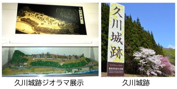 奥会津博物館伊南館の隣接地に「久川城跡(ひさかわじょうあと)」があり、伊南館内では関連史料や復元推定図、ジオラマを展示しています。博物館🄿に駐車したまま、城跡へ行くことができます。往時の城の姿や歴史に思いを馳せながら散策を楽しめます。さらに詳しくは、「久川城跡」をご覧ください。