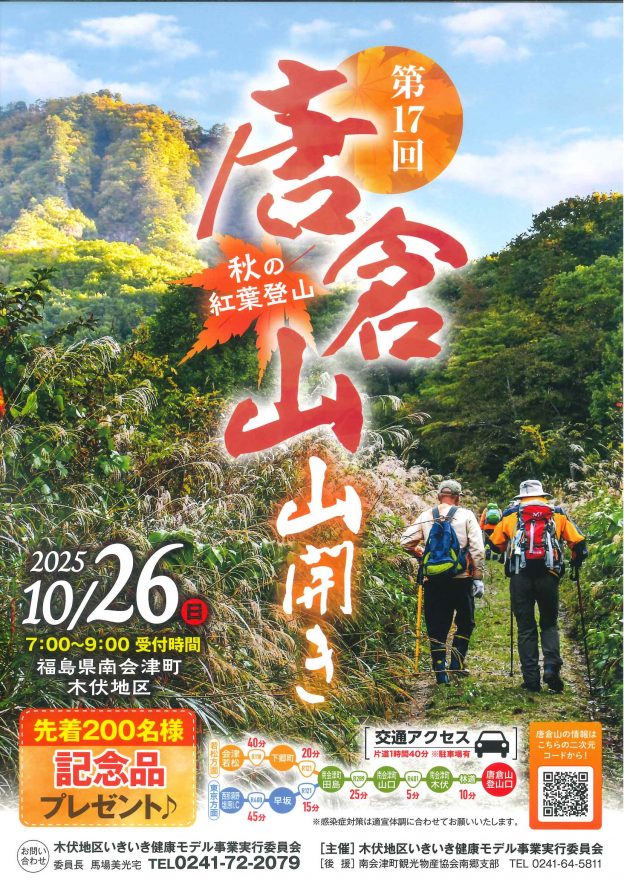 2025.10.26㊏「唐倉山山開き」を開催いたします。 受付時間:7:00~9:00 今年から、2025唐倉山山開き入山者カードをご記入ください。 2025.10.26唐倉山山開き入山者カードの ダウンロードはこちらから⇒ 2025.10.26唐倉山山開き入山者カード 当日は登山口広場にて設置しておりますので 入山者カードを記入の上受付時間までお待ちください。 ※イベント用入山者カードをお持ちの方は記入は不要です。 受付時間までお待ちください。 受付時に記念品(先着200名様限定)が 入った封筒と引き換えとなります。 ※受付後、封筒記載の番号が個人識別番号となりますので 必ずお持ちになり順次登山開始してください。 みなさまのお越しをお待ちしております♪ チラシのダウンロードはこちらから⇒ 2025唐倉山山開きチラシ